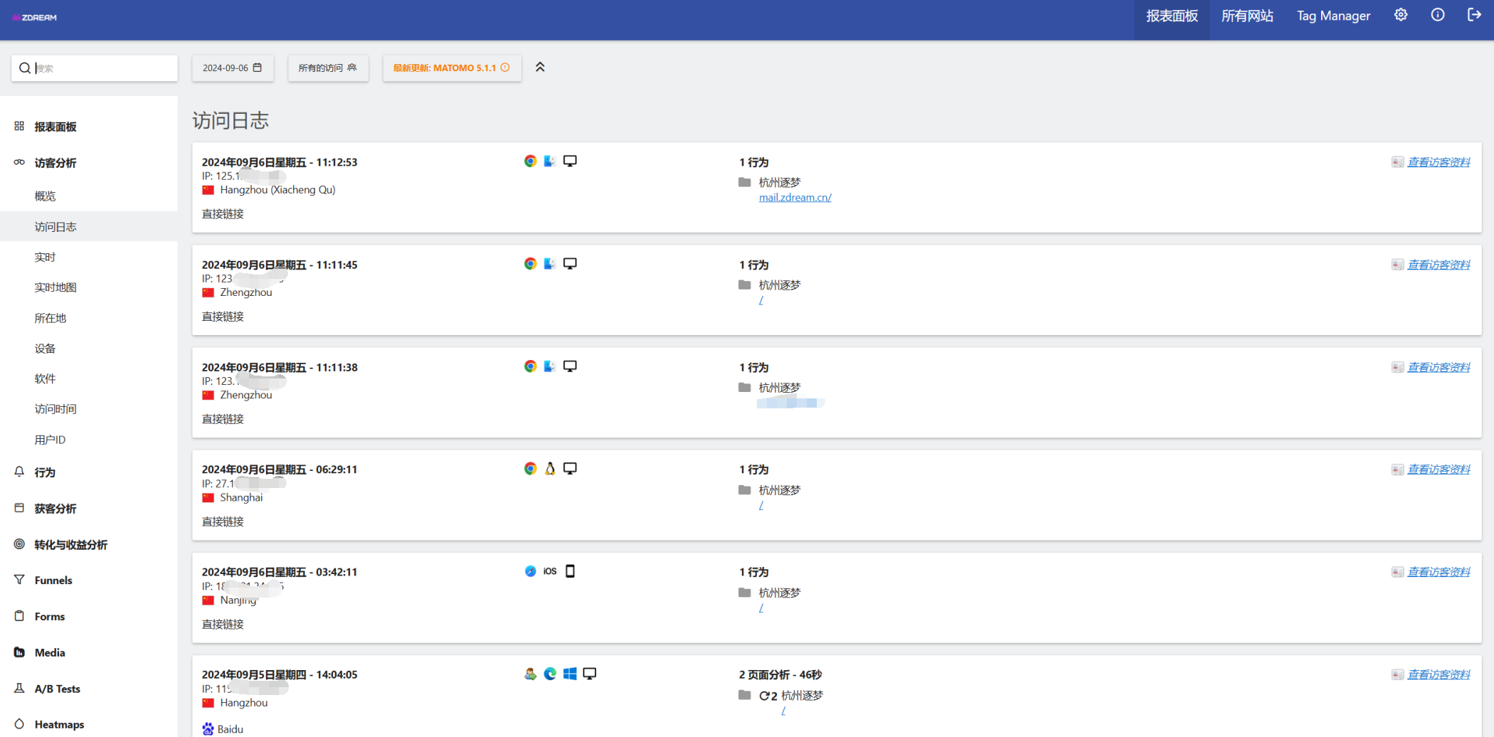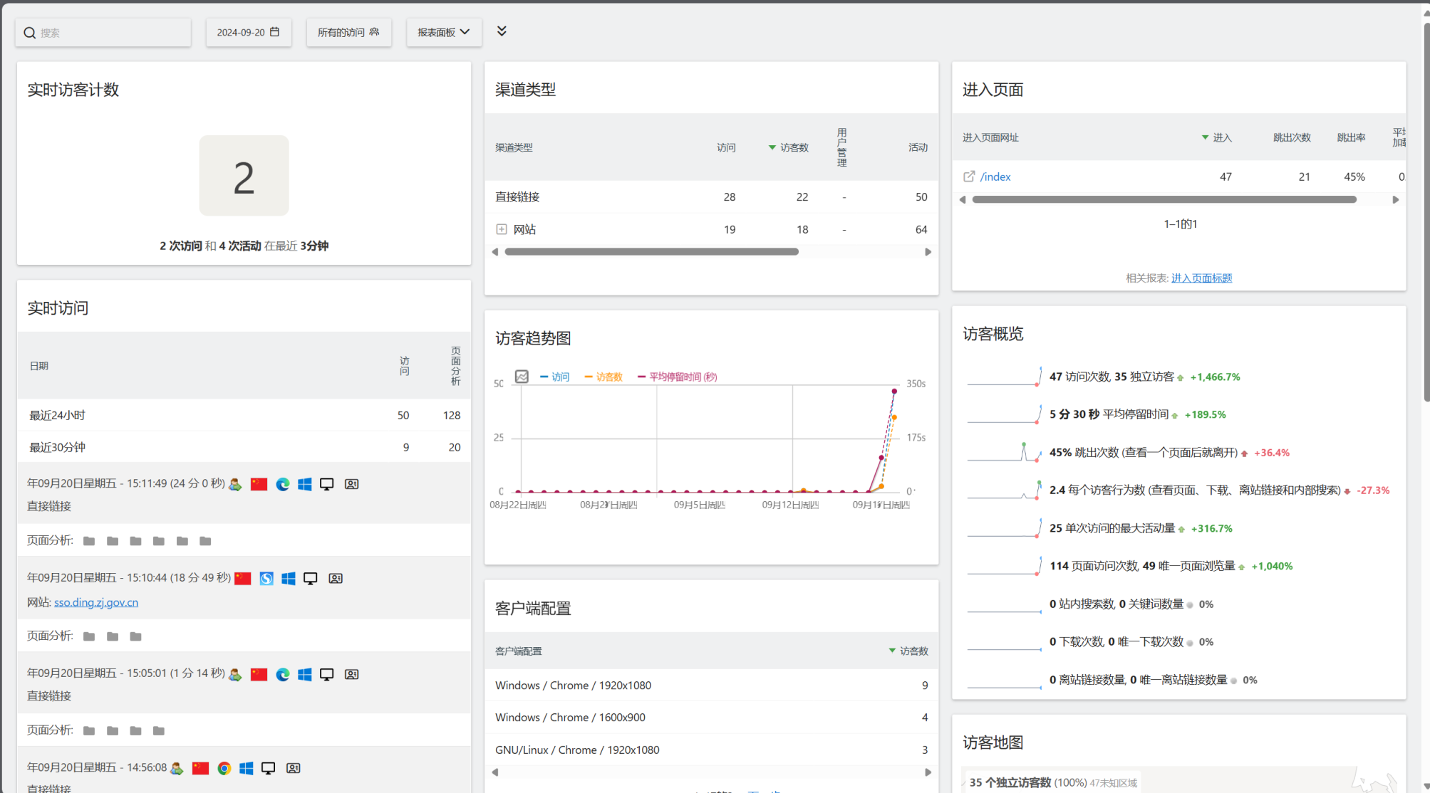 默认的仪表盘提供了丰富的信息模块,可以直观地看到实时的访客数量、访客的地理位置分布、访问趋势图、流量来源渠道、用户使用的操作系统和浏览器等。默认情况下,为了保护访客隐私,IP 地址是做了脱敏处理的,当然这个也可以根据需要进行修改。 通过这些数据,我可以清晰地看到哪些文章更受欢迎,访客是通过搜索引擎还是直接链接访问过来的。这些看似简单的信息,背后却能反映出很多问题,对于后续内容的调整和网站的优化,无疑是很有价值的。