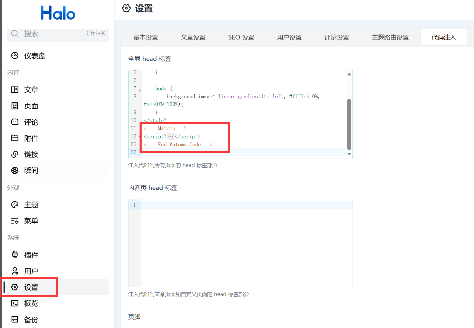 部署完成后,剩下的工作就简单了。Matomo 会提供一段 JavaScript 追踪代码,只需要将它嵌入到网站所有页面的 <head> 标签里即可,比如说Halo的代码注入全局标签: