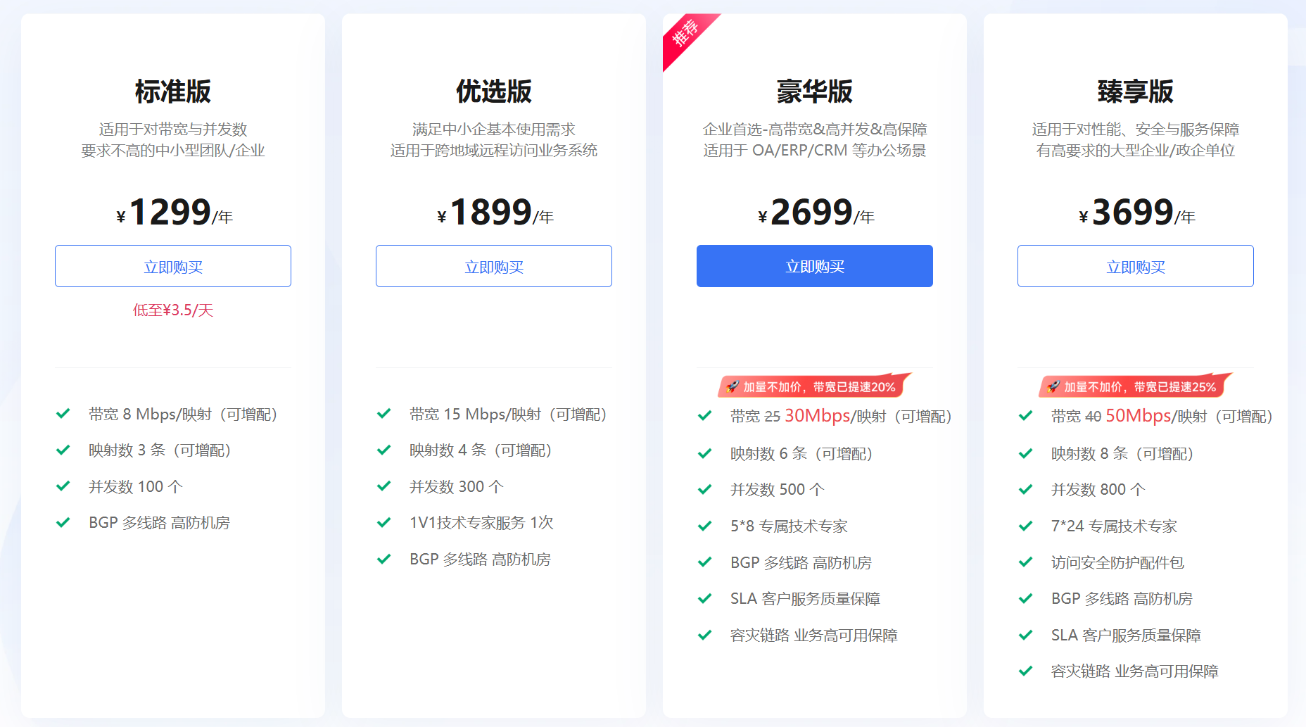 市面上存在一些商业化的内网穿透服务,例如“花生壳”。通过其价格表可以看出,即便是企业级套餐,其在带宽、并发连接数和功能上也存在诸多限制。例如,一个年费数千元的套餐可能只提供有限的带宽和映射数量,性价比不高,难以支撑稍有规模的应用。